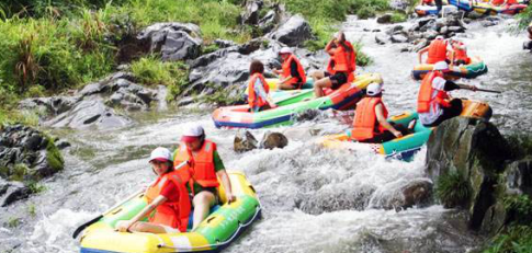 炎熱夏季,戶外漂流是消暑首選。乘著皮筏順流而下,穿梭在蜿蜒流動(dòng)的河中,陽光普照,四面青山環(huán)繞,漂流其間,迎面而來的涼風(fēng)與水珠沖刷掉了夏日的酷熱。刺激的漂流也似乎喚起了大家尋樂的童心,河道中彼此你追我趕,一旦相撞少不了要一場(chǎng)戲水激戰(zhàn)。飛濺的河水浸透了衣服,大家卻沉浸在快樂里。